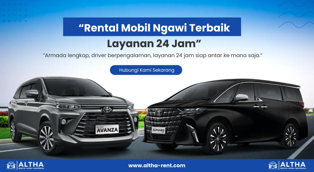 Ngawi yang berada di Jawa Timur terkenal dengan sejarah dan wisatanya, mulai dari Benteng Pendem Van den Bosch, situs fosil Trinil, hingga pesona alam yang menawan. Letaknya yang strategis di jalur utama Surabaya–Madiun–Solo–Yogyakarta membuat mobilitas jadi kebutuhan penting. Untuk perjalanan bisnis, liburan, atau sekadar jalan-jalan, rental mobil Ngawi dari Altha Rent bisa jadi solusi praktis. Dibanding transportasi umum yang terbatas atau taksi online yang kurang efisien, menyewa mobil memberi keleluasaan menentukan rute sendiri, lebih nyaman, dan tetap bisa menikmati privasi bersama keluarga maupun rekan.